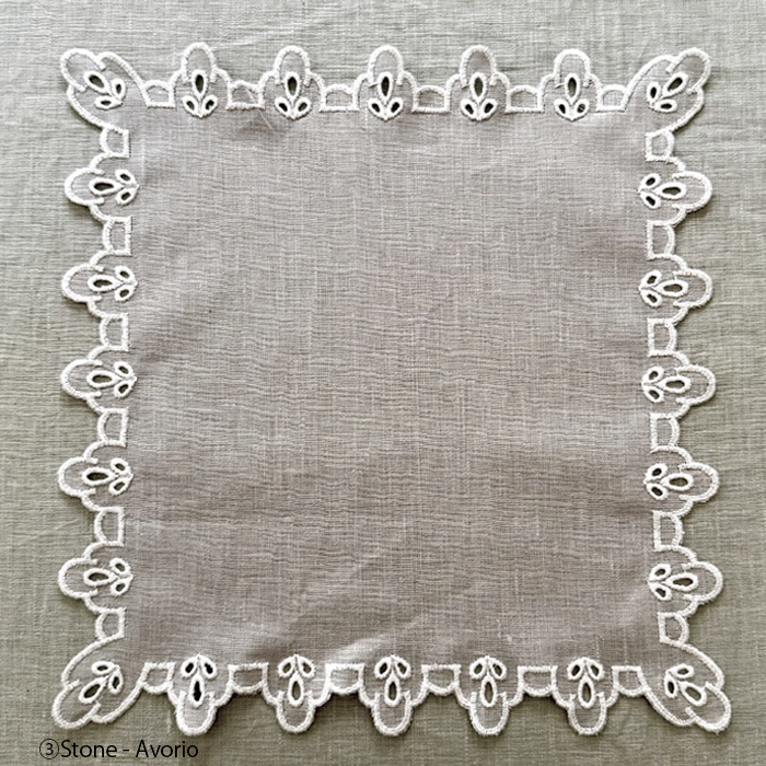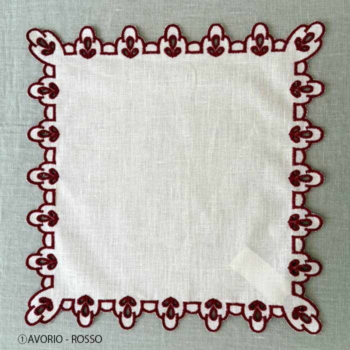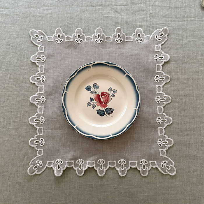 今回は、個性的なデザインなので、あえて35×35センチのサイズをセレクトしました。 テーブルマットとしてティータイムに。