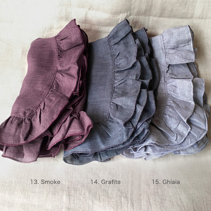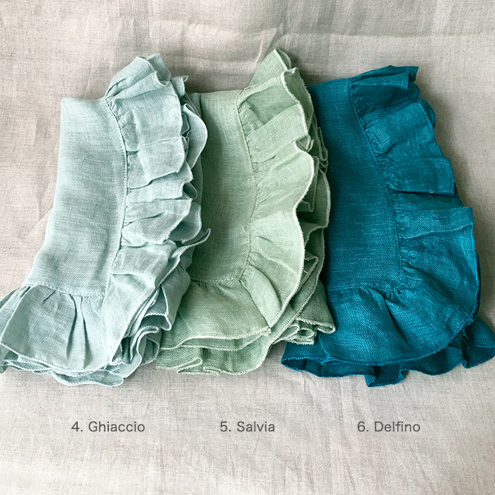 1. Limoncello2. Olio Gelato3. Noce4. Ghiaccio5. Salvia6. Delfino7. Rapa8. Corallo9. Fragola10. Mastice11. Stone12. Sabbia13. Smoke14. Grafite15. Ghiaia16. AVORIO18. Oxide19. AZZURRO20. MOSCATELLLO21. Tulle22. Fern23. Vichy Rosso24. Marinella