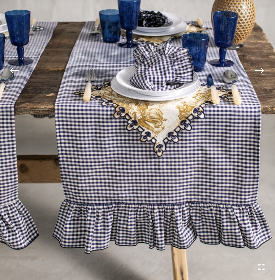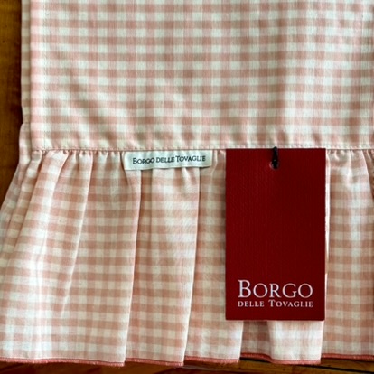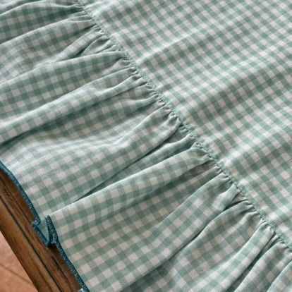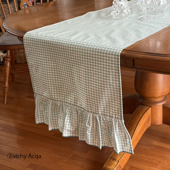 両側にフリルがデザインされているピンクチェック・水色グリーンチェックランナーです。同じチェックのFirenze(フィレンツエ)テーブルマットと合わせれてテーブルセッテイングをなさっても素敵です。