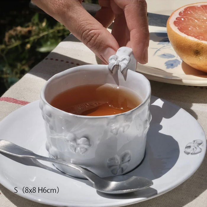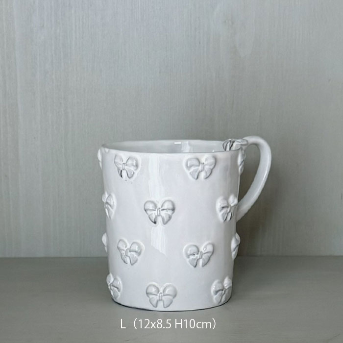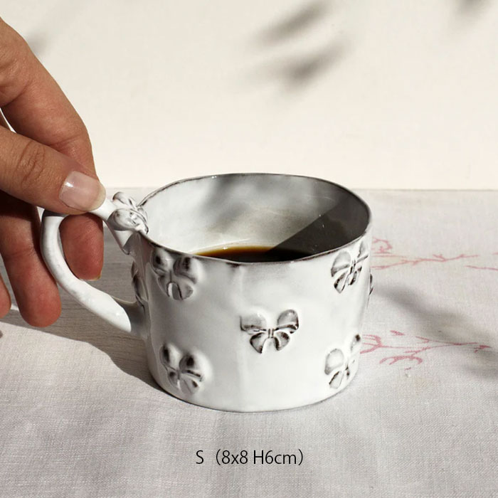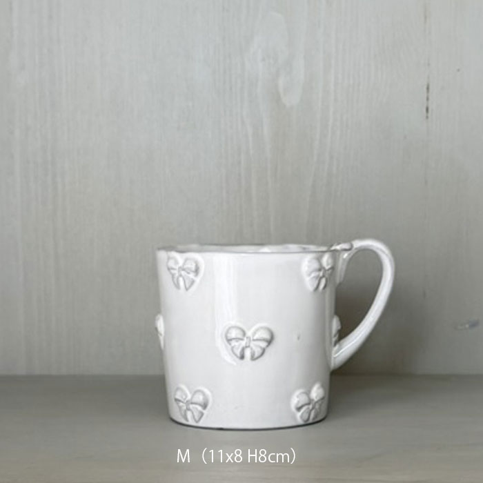 リボンがいっぱいのマグカップ、軽く使いやすくそしてドキドキしてしまうカップです。