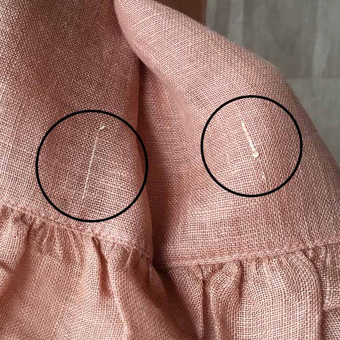 未処理の糸(左)や麻素材特有のネップ(織むら・右)が見られます。
